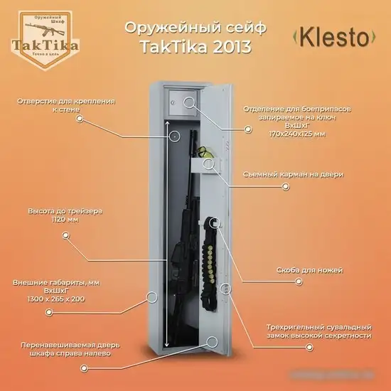 Оружейный сейф Klesto TakTika 2013 предназначен для хранения оружия и ценностей. Он выполнен из прочной стали и имеет взломостойкую конструкцию, что обеспечивает безопасность. Внутри есть один трейзер для хранения документов или мелких предметов. Размеры сейфа позволяют разместить его в помещении без проблем: ширина — 265 мм, высота — 1300 мм, глубина — 200 мм. Замок у сейфа ключевой, что обеспечивает надежную защиту. Вес сейфа — 13 кг, он легко устанавливается на стену или пол. Этот сейф подойдет для тех, кто ценит безопасность и простоту использования.