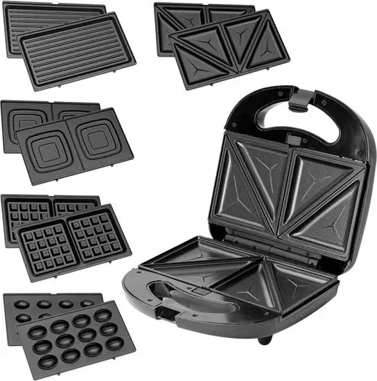 многофункциональная сэндвичница, 750 Вт, поверхность: гриль-пластина/форма для 2 ломтиков хлеба/вафельница/орешница/мини-кексы, съемные плитки, черный