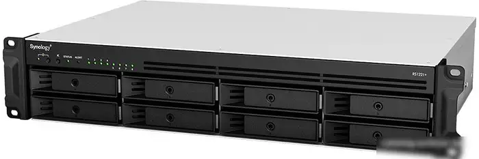 Сетевой накопитель Synology RackStation RS1221RP+ подходит для резервного копирования, хранения файлов, веб и почтовых серверов, видеонаблюдения и виртуализации. Он устанавливается в 19-дюймовую стойку и занимает 2U пространства, имеет 8 отсеков для жестких дисков и внешний порт для подключения дополнительных устройств. Благодаря мощному процессору AMD Ryzen V1500B и 4 ГБ оперативной памяти (с возможностью расширения до 32 ГБ) устройство быстро обрабатывает данные. Поддерживаются различные файловые системы и RAID уровни, что обеспечивает безопасность и надежность хранения информации. Обеспечивается аппаратное шифрование данных и горячая замена дисков без остановки работы. RS1221RP+ подключается к сети через 4 порта Gigabit Ethernet и поддерживает работу с внешними облачными сервисами, такими как Google Drive или Dropbox. Встроенные функции позволяют управлять виртуальными машинами и работать с IP-камерами. Устройство также умеет работать как медиа и веб-сервер, поддерживая протоколы FTP, SMB, AFP, NFS и другие.
