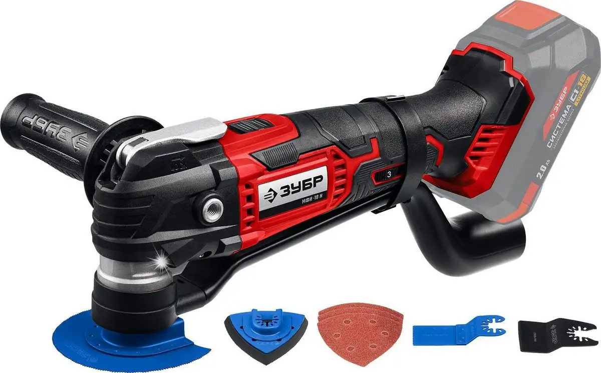 Реноватор Зубр МФИ-18 Н — многофункциональное устройство для работы с разными материалами. Оно работает на аккумуляторе Li-ion от 18 В, который обеспечивает долгий срок работы, а вместе с регулятором оборотов пользователь легко контролирует скорость колебаний от 5 000 до 20 000 в минуту. Устройство имеет угол колебаний 3°, что позволяет выполнять аккуратную работу без лишних усилий. Бесключевая замена оснастки упрощает смену насадок, а система крепления OQIS обеспечивает надежность. В комплект входит разнообразные насадки: пильные, шлифовальная подошва и наждачная бумага — всё для разных задач. Устройство легко подсоединяется к пылесосу, что помогает поддерживать чистоту во время работы. Вес реноватора — всего 1,2 кг, что делает его удобным и маневренным. Эта модель подходит для домашнего использования и ремонта разной сложности.
