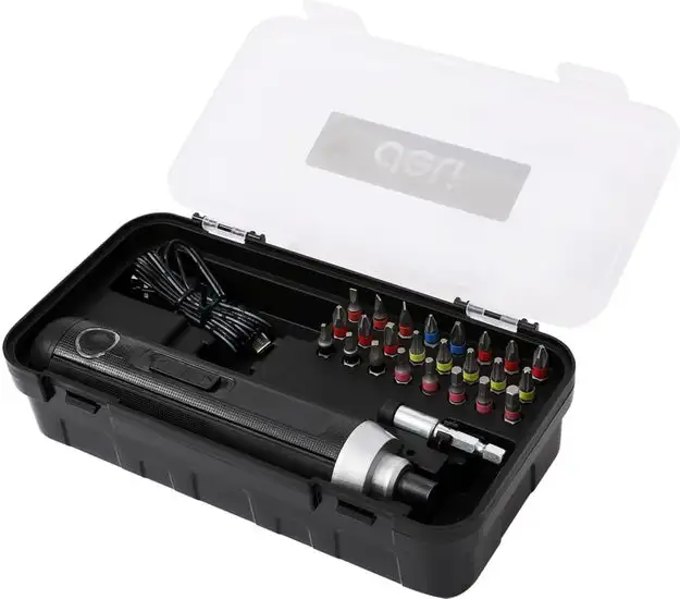 | Комплектация | Аккумуляторная отвёртка Кабель USB type-C Магнитный держатель-удлинитель Набор бит - 24 шт. Инструкция Кейс |