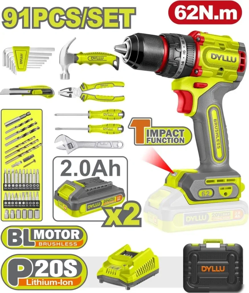 Ударная дрель-шуруповерт Dyllu DTDT4B91 (с 2-мя АКБ, кейс, набор инструментов)