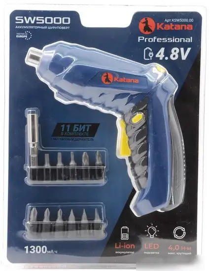 Электроотвертка Katana SW5000 предназначена для выполнения домашних и профессиональных задач. Она работает на аккумуляторе Li-ion напряжением 4.8 В и оснащена одним аккумулятором емкостью 1.3 А·ч, что обеспечивает длительную работу. Устройство имеет шесть различных насадок и адаптер для бит, что делает его универсальным инструментом для разных задач. Быстросменный патрон диаметром до 5 мм позволяет быстро менять насадки без дополнительных инструментов. Электроотвертка обладает максимальной скоростью вращения 200 об/мин и крутящим моментом 4 Н·м, что подходит для работы с разными материалами. Световая подсветка помогает точно видеть рабочую зону даже в плохо освещённых местах. Есть реверс для удобного выкручивания шурупов и выполнения различных монтажных работ. Устройство легкое и компактное — всего 270 г, что обеспечивает удобство использования. Каталог включает комплект из отвертки, кабеля USB, набора бит и руководства, что сразу готово к работе.