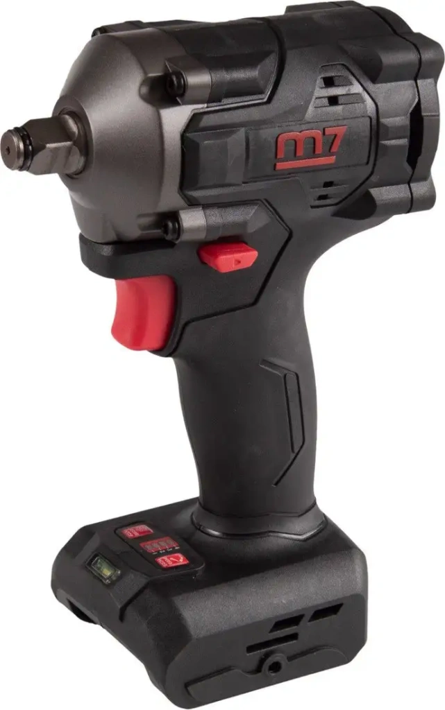 Гайковерт M7 DW-404 — это мощный инструмент для выполнения различных крепежных работ. Он работает от аккумулятора с напряжением 18 В и обеспечивает максимальный крутящий момент 900 Н·м, что помогает быстро закручивать надежные соединения. Устройство имеет патрон на четырехгранник 1/2" и достигает скорости до 2 200 об/мин, что увеличивает эффективность работы. В гайковерте есть четыре режима скорости и функция регулировки оборотов, чтобы подобрать оптимальные параметры для каждой задачи. Бесщеточный мотор обеспечивает долговечность и меньшую износостойкость, а реверс позволяет откручивать болты и гайки. Подсветка освещает рабочую зону, что удобно при работе в темных местах. Вес гаджета составляет 1 400 г, он легко управляем и удобен в использовании. Для работы потребуется отдельно приобрести батарею и зарядное устройство, они не входят в комплект. Гайковерт не имеет фиксированной кнопки включения и кейса, что позволяет работать без лишних элементов. Этот инструмент идеально подойдет для профессиональных и домашних задач.