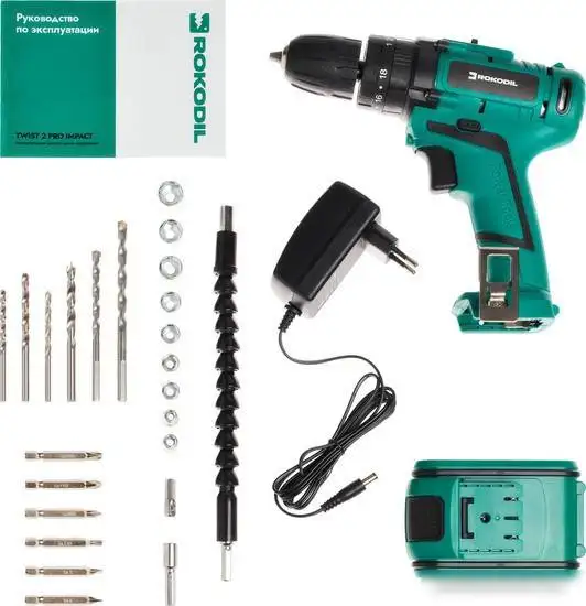 | Комплектация | 1. Аккумуляторная дрель-шуруповерт Rokodil Twist 2 Pro 2. Литий-ионный аккумулятор RBA-18V-2A 3. Зарядное устройство RCA-21V-1.5A 4. Руководство по эксплуатации 5. Пластиковый кейс для транспортировки и хранения 6. Поясная клипса 7. Биты S2 (6 шт.) 8. Сверла HSS М2 (6 шт.) 9. Торцевые головки (9 шт.) 10. Удлинитель для бит жесткий (1 шт.) 11. Удлинитель для бит гибкий (1 шт.) 12. Соединительная штанга (1 шт. |