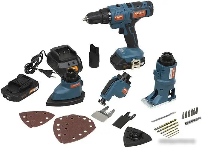 | Комплектация | Аккумуляторный инструмент Аккумуляторная батарея (2шт) Зарядное устройство Рабочая насадка-шуруповерт Рабочая насадка-лобзик Рабочая насадка для шлифования Рабочая насадка-реноватор Набор бит (6шт) и адаптер для бит Набор сверл (6шт) Пильное полотно Дельтовидная платформа для шлифования Шлифовальная бумага (4шт) Насадка для реноватора (2шт: шабер, пила) Патрубок для пылеотвода Инструкция по эксплуатации Инструкция по безопасности Кейс |