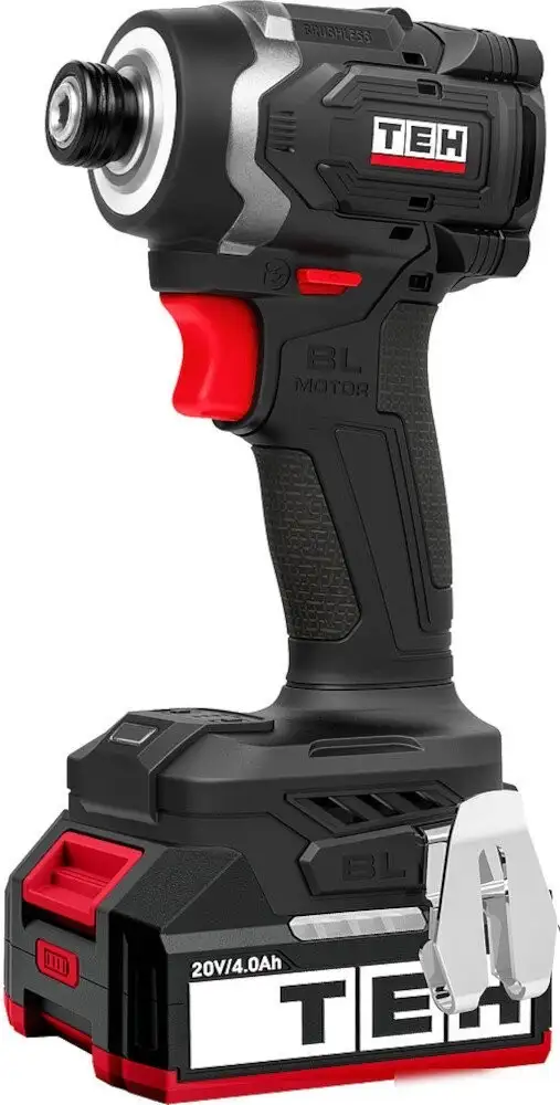 Винтоверт TEH LID230-1B оснащён мощным бесщеточным двигателем, который обеспечивает быстрое и эффективное выполнение работы. Он работает на одной аккумуляторной батарее типа Li-ion с напряжением 20 В и ёмкостью 4 А•ч, что позволяет долго использовать инструмент без подзарядки. Устройство имеет шестигранный патрон 1/4", позволяющий быстро менять насадки, и регулирует скорость вращения до 3500 об/мин для разных задач. Максимальный крутящий момент достигает 230 Н·м, а частота ударов — 4000 ударов в минуту, что делает его очень мощным. В винтоверте есть функция регулировки оборотов и реверс, чтобы удобно вкручивать и выкручивать. Встроенная подсветка освещает рабочую область, а индикатор уровня заряда помогает следить за состоянием батареи. В комплект входит кейс, аккумулятор и зарядное устройство, что облегчает транспортировку и хранение.