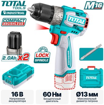 Дрель-шуруповерт Total TDLI16682 (с 2-мя АКБ, кейс)
