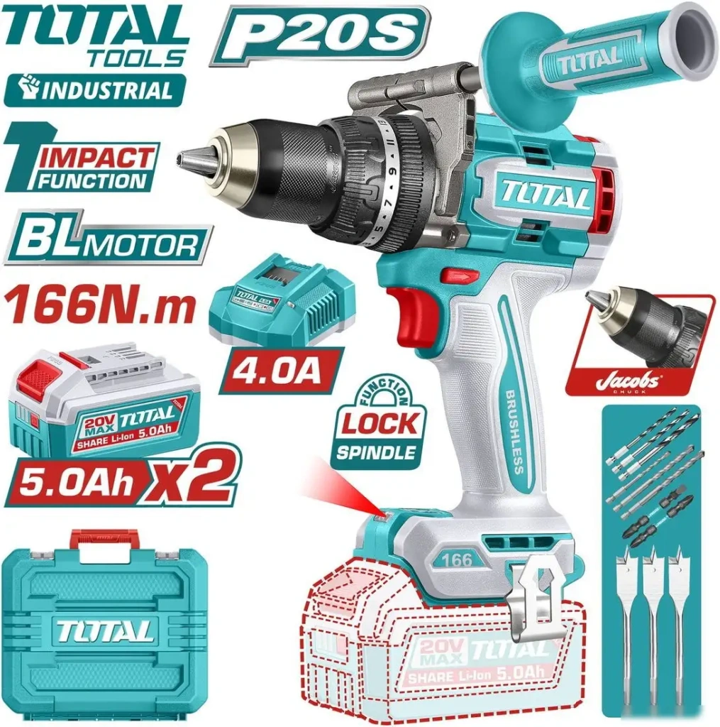 Ударная дрель-шуруповерт Total TIDLI201668 подходит для домашних и профессиональных задач. Она работает на аккумуляторах, использует быстрой зажимной патрон и имеет мощный бесщеточный двигатель, что обеспечивает долговечность и эффективность. Максимальная скорость вращения достигает 2100 об/мин, а крутящий момент — до 166 Н·м, что помогает легко сверлить в металле, дереве и бетоне. Регулировка скорости и крутящего момента позволяет точно управлять работой. В устройстве есть подсветка, индикатор заряда аккумулятора и блокировка шпинделя для удобства использования. Два аккумулятора емкостью 5 А•ч обеспечивают длительную работу, а время зарядки — около 75 минут. Для удобства в комплект вошёл кейс и разнообразный инструмент — сверла, биты и дополнительная рукоятка. Это устройство удобно для работы на стройке или дома, благодаря надежной сборке и расширенной комплектации.