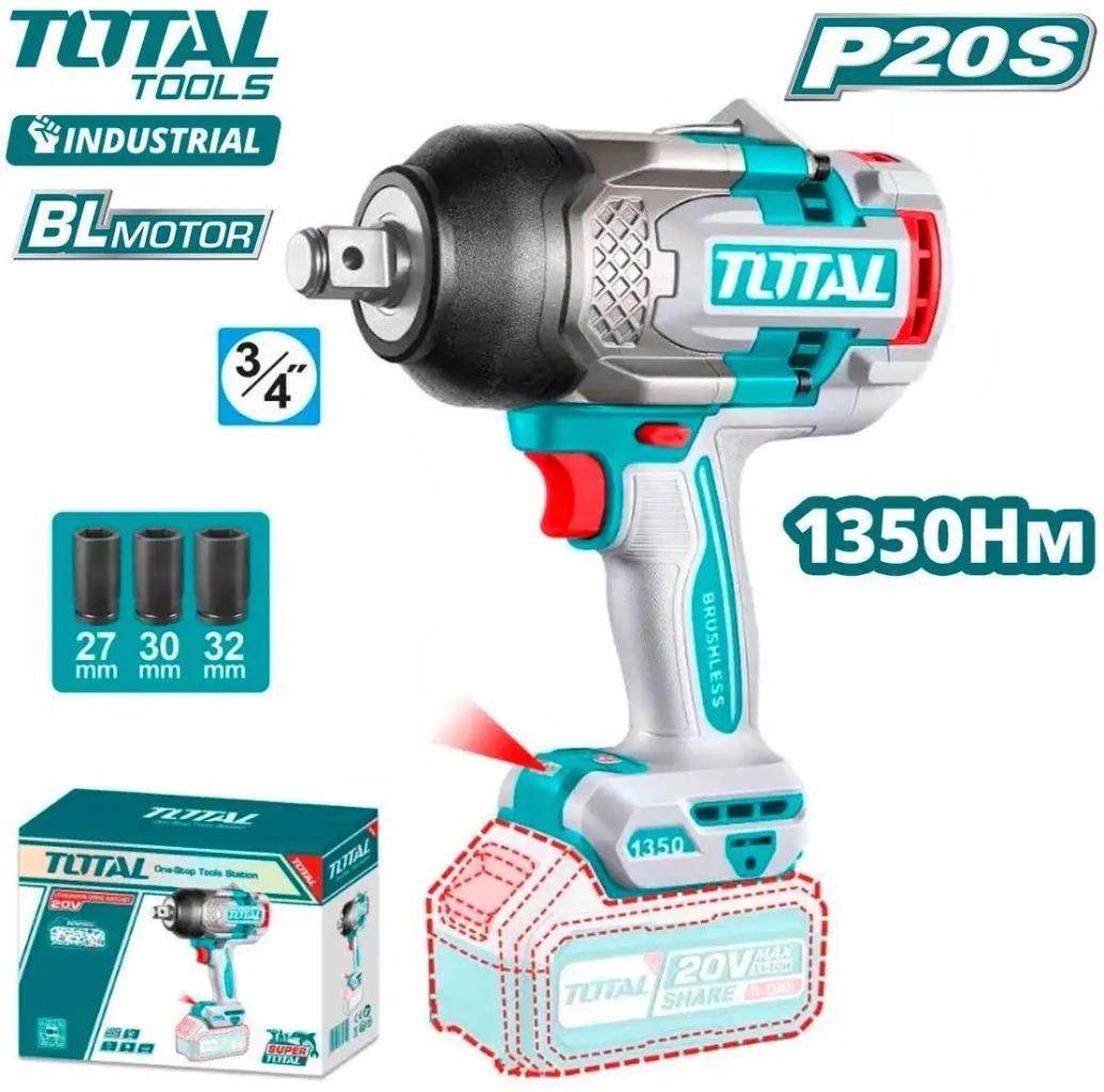 Гайковерт Total TIWLI201351 работает от аккумулятора и не включает комплект батареи. Он подходит для работы с патроном на 3/4" и достигает скорости до 1800 об/мин. Максимальный крутящий момент составляет 1350 Н·м, что позволяет легко закручивать и откручивать тяжелые болты. Гайковерт включает три скорости и регулируемую обороты, чтобы выбрать подходящий режим. В устройстве установлен бесщеточный двигатель, который обеспечивает более долгий срок службы и меньшие потери энергии. Оно оснащено подсветкой для работы в плохо освещенных местах и реверсом для обратного вращения. Вес прибора — около 5,3 кг, что делает его удобным для использования. В комплект входит слесарная головка и три торцевых насадки на 27, 30 и 32 мм. Этот инструмент отлично подходит для профессионального использования.