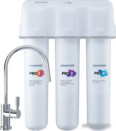 Стационарная система "под мойкой" АКВАФОР ECO Pro обеспечивает чистую питьевую воду прямо из-под кранa. Она оснащена тремя фильтрами, которые удаляют нерастворимые примеси, хлор, металлы, деманган, а также бактерии и вирусы для обеззараживания воды. Модель подходит для использования с холодной водой и не предназначена для горячей. Фильтры работают с производительностью 2,5 литра в минуту и имеют ресурс 10 000 литров. Простая в установке и эксплуатации, система не требует помпы, есть краник для удобного использования. Такие функции позволяют обеспечить свежую и безопасную воду для всей семьи.