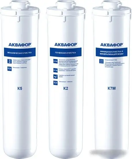 | Описание фильтра | Комплект картриджей для фильтров Аквафор DWM-101 и Аквафор DWM-101S.Включает в себя три сменных модуля:- модуль K5 предназначен для предварительной очистки. Отфильтровывает ржавчину, песок и другие частицы размером более 5 микрон- модуль K2 отвечает за глубокую фильтрацию. Угольный модуль (карбфайбер блок) впитывает хлор и другие растворенные примеси и удаляет тяжелые металлы. Отфильтровывает частицы размером от 3 микрон- модуль K7M отвечает за постфильтрацию и минерализацию, обогащает воду и восстанавливает pH воды до нейтрального |