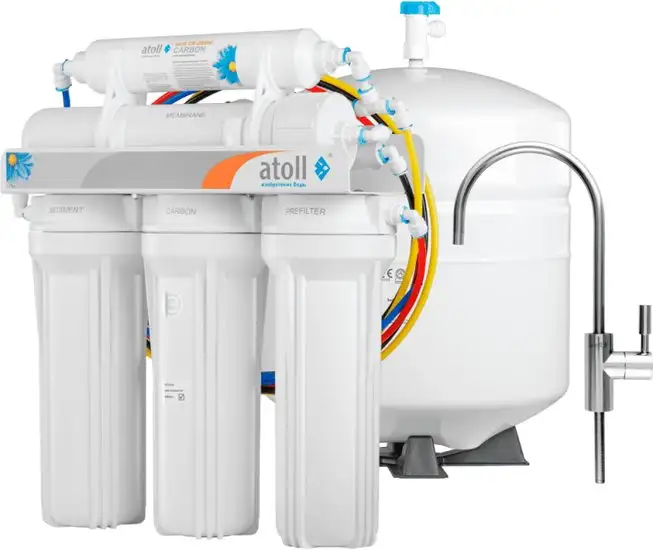| Прочее | Система состоит из: Предфильтров — обеспечивают предварительное очищение от примесей, которые не растворяются, а также от хлора, органики и т.д. до того, как вода попадает в мембранный элемент. Предфильтры помогают увеличить эксплуатационный срок основного фильтр-элемента обратноосмотической системы — мембраны. Очищение происходит в 3 ступени: atoll P5 на первом этапе удаляются механические примеси больше 5 мкм: песок, ржавчина и подобное; atoll GAC-10 (гранул.уголь) на втором этапе происходит очищение от хлора; atoll P1 на третьем этапе вода фильтруется от примесей размером больше 1 мкм. Мембраны atoll TW40-1812-50 — фильтр-элемент состоит из специального материала с микропорами 0,001 мкм, они задерживает любые примеси, пропускают только воздух, молекулы воды. Если поверхность мембраны засорится, то процесс удаления примесей полностью остановится. Но в системах Атолл загрязнения не задерживаются на фильтр-элементе, а смываются в канализацию. Это значительно продлевает срок эксплуатации, как и трехступенчатая предварительная очистка воды. Емкость для накопления с общим объемом в 18 литров и полезным в 12 литров — резервуар для отфильтрованной воды. Постфильтра atoll CK2586C — 5-тый этап очистки непосредственно перед подачей воды в кран. Постфильтр не только улучшает вкус воды, но и освежает ее, если система продолжительное время не функционировала и профильтрованная вода застоялась. Крана. Помогает разделить водные потоки — питьевой и бытовой, тем самым продлевая ресурс сменных элементов за счет более экономного расхода и фильтрации только употребляемой воды. |