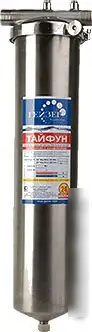 | Описание фильтра | Корпус магитрального бытового фильтра Гейзер Тайфун 20 BB (мировой стандарт картриджей Big Blue 20) представляет собой разборную колбу из нержавеющей стали марки 304L |