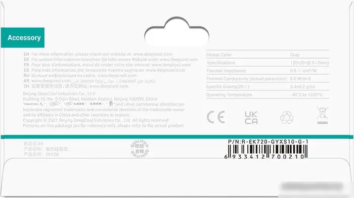 Термопрокладка DeepCool EK720-XS-1.5 обеспечивает эффективное охлаждение компонентов благодаря высокой теплопроводности 6 Вт/(м·К). Ее размеры 120×20×1,5 мм позволяют легко установить в доступные пространства. Тонкий слой толщиной 1,5 мм помогает обеспечить плотное прилегание между деталями и уменьшить тепловые потери. Материал быстро передает тепло, что способствует стабильной работе системы. Простая установка и универсальные размеры делают эту прокладку подходящей для различных устройств. Она помогает снизить температуру компонентов и повысить их надежность. Устройство не вызывает коррозии и долговечно служит в системе охлаждения. Благодаря хорошей теплопроводности, она быстро справляется с рассеянием тепла. Это средство улучшает эффективность охлаждения и продлевает срок службы комплектующих.