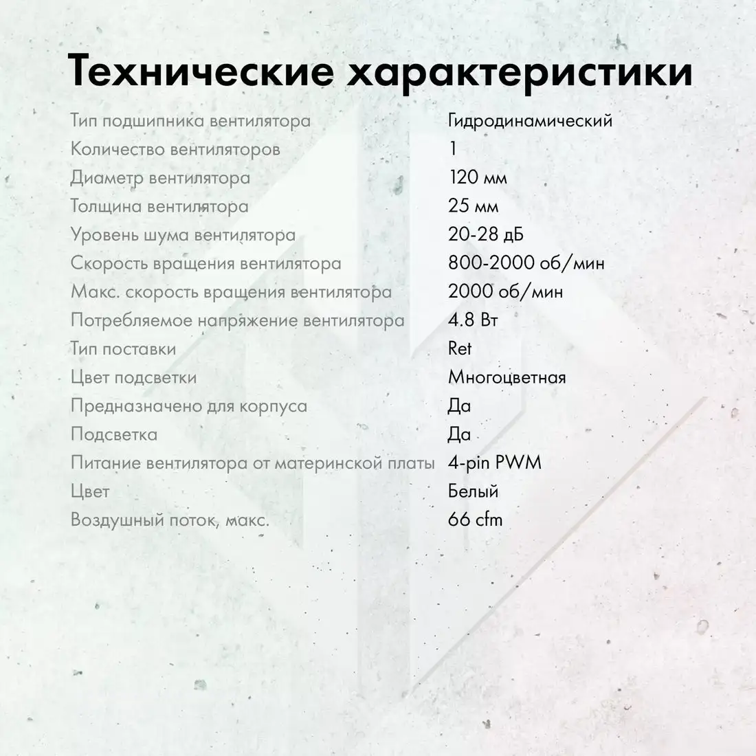 высота 25 мм, макс. шум 28 дБ, вентилятор 120 мм, 2000 об/мин, PWM, подшипник гидродинамический (FDB), ARGB подсветка