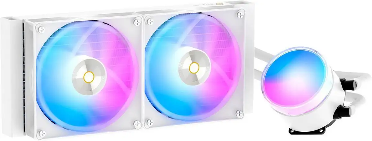 Жидкостное охлаждение Ocypus Delta L24 WH ARGB предназначено для процессоров с разъемами AM4, AM5, LGA1200 и другими, обеспечивая эффективное охлаждение до 280 Вт TDP. Радиатор размером 240 мм сделан из алюминия и имеет два вентилятора диаметром 120 мм с гидродинамическими подшипниками, которые работают тихо — максимум 29 дБ. Вентиляторы регулируются по скорости от 500 до 2000 об/мин, что позволяет лучше контролировать уровень шума и охлаждение. В водоблоке используется медь, которая быстро отвода тепла, а при этом он весит 1220 г. В системе есть ARGB-подсветка, улучшающая внешний вид ПК, а контролировать скорость вентиляторов можно через PWM. Трубка длиной 0,4 м удобна в монтаже, а размеры позволяют легко установить систему в корпусе. Максимальный воздушный поток достигает 73 CFM, а встроенного дисплея нет. Устройство сочетает тихую работу и хорошую производительность для современных процессоров.