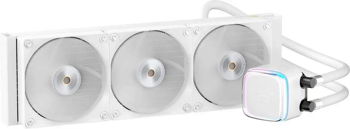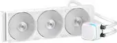 Жидкостное охлаждение Ocypus Iota L36 WH предназначено для эффективного охлаждения процессоров с сокетами AM5, AM4, LGA1700 и другими. Оно рассчитано на рассеиваемую мощность до 300 Вт, что помогает сохранять низкую температуру даже при высокой нагрузке. Радиатор длиной 397 мм выполнен из алюминия и содержит три вентилятора диаметром 120 мм с гидродинамическими подшипниками, обеспечивающими тихую работу и воздушный поток до 77 CFM. Вентиляторы работают с PWM-контролем, регулируя скорость от 500 до 2000 об/мин и уменьшая уровень шума до 29 дБ. В системе есть встроенный дисплей на водоблоке, который показывает параметры работы. Водоблок выполнен из меди и соединяется с радиатором трубками длиной 0,4 м, что обеспечивает стабильное охлаждение. В комплект входит водоблок, помпа с максимальной скоростью 3100 об/мин, а также подключение к питанию через 3-pin, USB и ARGB. Это охлаждение гарантирует хорошую производительность и подходит для систем, требующих мощного охлаждения без лишнего шума.