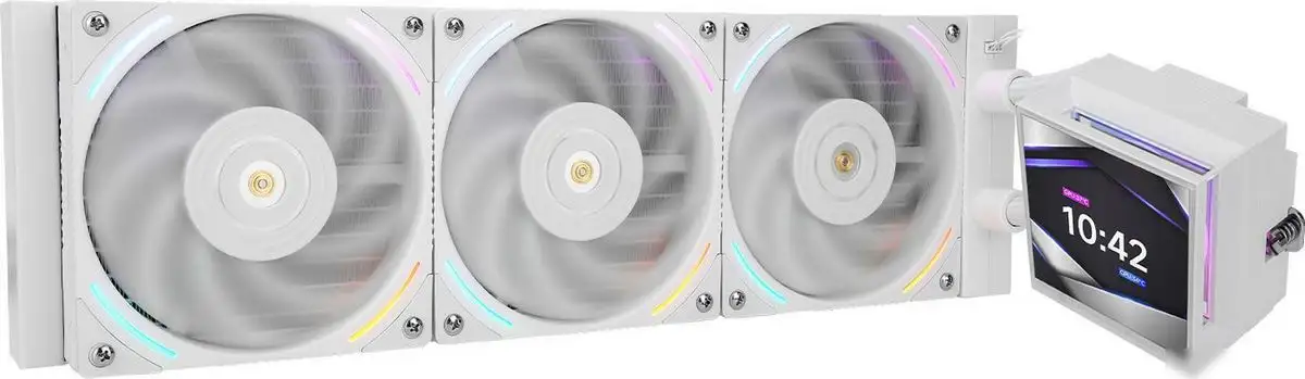 Система жидкостного охлаждения Thermalright Hyper Vision 360 ARGB в белом цвете обеспечивает эффективное охлаждение процессора с помощью замкнутого контура (AIO) и жидкостного метода. Она совместима с различными сокетами, такими как AM4, AM5, LGA1700 и другими, что делает её универсальной. В комплект входят три вентилятора диаметром 120 мм, которые создают высокий воздушный поток до 69 CFM, а их гидродинамические подшипники обеспечивают плавную работу и долговечность. Водоблок и радиатор выполнены из алюминия, а встроенный дисплей на радиаторе показывает важную информацию. Благодаря PWM-управлению и подсветке ARGB устройство позволяет настроить характеристики охлаждения и внешний вид под свои предпочтения. Максимальная скорость вентилятора достигает 2 150 оборотов в минуту, а уровень шума остаётся низким — не выше 27 дБ. В комплект входит термопаста, крепления и кабель-разветвитель, что облегчает установку. Эта система помогает поддерживать стабильную температуру процессора даже при высокой нагрузке и имеет яркий дизайн с подсветкой.