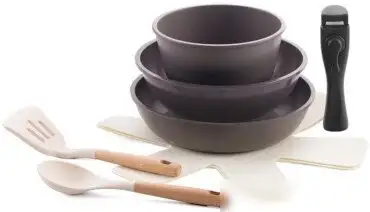 | Состав набора | сковорода 26 см, вок 24 см, сотейник 18 см, съемная ручка, лопатка, ложка |