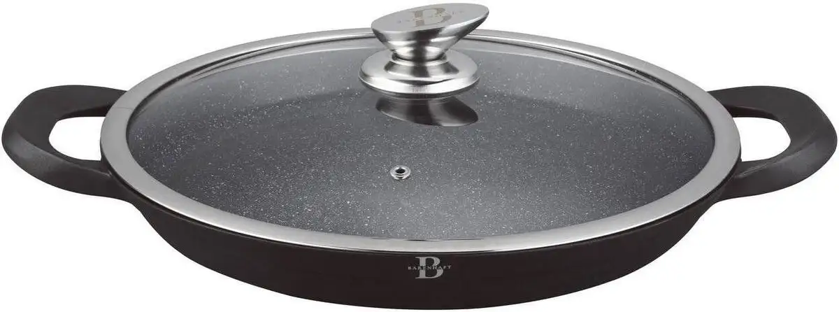 Эта сковорода Lenardi 818-013 выполнена из алюминия, что обеспечивает равномерное распределение тепла. Она имеет круглый формат с диаметром 32 см и объемом 3,5 литра, что удобно для готовки больших порций. Благодаря минеральному мраморному антипригарному покрытию, пища не пригорает, а мытье посуды становится проще. Крышка из стекла помогает лучше контролировать процесс готовки. Совместимость с газовыми и электрическими конфорками делает эту сковороду универсальной. Ее можно безопасно мыть в посудомоечной машине, что экономит ваше время. Алюминиевая ручка надежно крепится и не нагревается во время использования. Эта модель подойдет для повседневной готовки и легко справляется с разными блюдами.