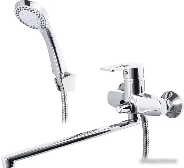 Смеситель Ekko E22072 предназначен для ванной и душа, его можно установить на стену, используя два монтажных отверстия. Он выполнен в стильном хромированном цвете и сделан из прочного силумина. Смеситель оборудован однорычажным механизмом, который легко регулирует температуру и поток воды. У него есть керамический картридж для долговечности и поворотный излив, что удобно при использовании. В комплект входит душевой гарнитур для удобства. Размеры смесителя: длина 400 мм, ширина 179 мм, высота 170 мм.