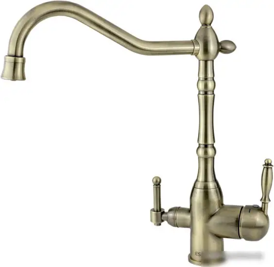 Смеситель Esko Florence FR 519 Br предназначен для кухни и подходит для установки на раковину или столешницу. Он выполнен из долговечной латуни и имеет стильный бронзовый цвет, который отлично впишется в любой интерьер. Механизм однорычажного типа позволяет легко регулировать температуру и поток воды одной рукой. Смеситель оснащен керамическим картриджом 35 мм, что обеспечивает долговечную и плавную работу. Его поворотный излив с длиной 236 мм удобно для мытья посуды и продуктов. Конструкция включает встроенный кран для питьевой воды, что делает использование еще удобнее.