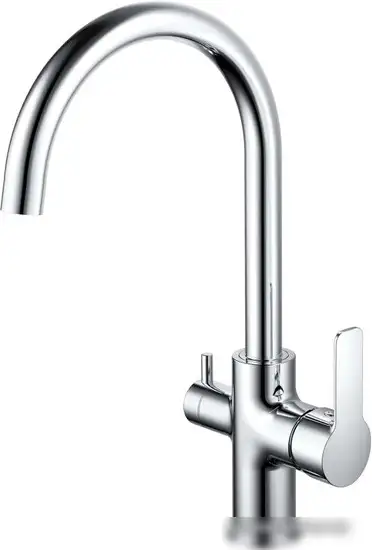 Смеситель Esko K27 предназначен для кухни и устанавливается на раковину или столешницу через одно монтажное отверстие. Он выполнен из прочной латуни с хромовым покрытием, что обеспечивает долговечность и эстетичный вид. Механизм однорычажный позволяет легко регулировать температуру и поток воды одной рукой. Высокий поворотный излив с высотой 253 мм обеспечивает удобство при мытье посуды и продуктов. Встроенный кран для питьевой воды дает возможность использовать чистую воду без дополнительных приборов. Керамический картридж диаметром 35 мм обеспечивает надежность и долгий срок службы. Смеситель легко управляется и не требует подключения к посудомоечной или стиральной машинам. Благодаря современному дизайну он хорошо впишется в любую кухню.