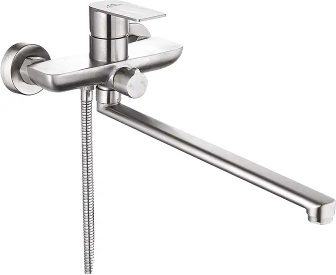 Смеситель Fashun A52219 предназначен для ванной и душа. Он имеет однорычажный механизм, который легко регулирует температуру и поток воды. Устройство выполнено из прочной стали с красивым сатиновым покрытием. Смеситель устанавливается на стену и имеет два монтажных отверстия, что облегчает монтаж. Он оснащен керамическим картриджем диаметром 35 мм, что обеспечивает долговечность и надежность. Поворотный излив длиной 390 мм позволяет удобно направлять воду. В комплект входит душевой гарнитур для комфортного использования.