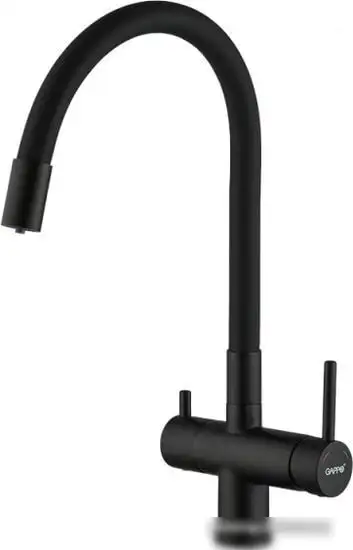Смеситель Gappo G4398-36 предназначен для установки на кухонную мойку или столешницу, он крепится через одно отверстие. Он выполнен из прочной латуни и имеет черный цвет, который хорошо сочетается с современной кухней. Механизм однорычажный — удобно регулировать воду одной рукой. Встроенный кран для питьевой воды позволяет подготовить свежую воду прямо из смесителя. Излив поворотный и выдвижной/гибкий — это удобно для мытья больших посуд и быстрого доступа к воде. Керамический картридж длиной 35 мм обеспечивает долгий срок службы и лёгкое управление. Высота смесителя — 417 мм, длина излива — 220 мм, что удобно для работы на кухне.