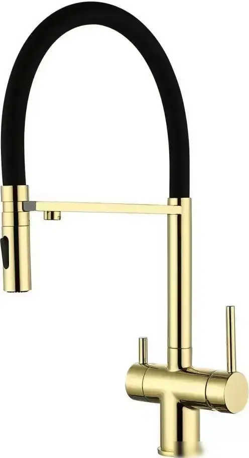 Смеситель Grocenberg GB4096 в золотом цвете отлично подходит для кухни и предназначен для подачи питьевой воды. Он устанавливается на раковину или столешницу через одно монтажное отверстие. Благодаря встроенному крану для питьевой воды и наличию керамического картриджа диаметром 40 мм, устройство обеспечивает надежное и быстрое управление потоками воды. Поворотный излив и выдвижной, гибкий шланг позволяют легко регулировать позицию и длину излива для удобства при мытье посуды и продуктов. Габариты смесителя: высота 490 мм, длина излива до 225 мм, высота излива 180 мм. Конструкция из прочной латуни обеспечивает долговечность. Этот смеситель сочетает стильный дизайн с удобством использования и надежностью.