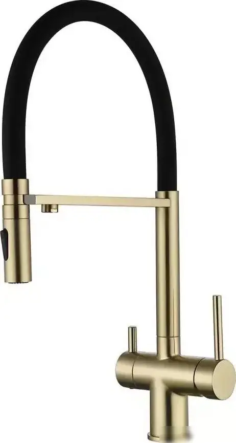 Смеситель Grocenberg GB4096 в золотом матовом цвете отлично подходит для кухни и подачи питьевой воды. Он устанавливается на раковину или столешницу через одно монтажное отверстие. Смеситель сделан из прочной латуни, что обеспечивает долговечность и надежность. Встроенный кран для питьевой воды позволяет удобно получать чистую воду. Керамический картридж диаметром 40 мм гарантирует плавное и долговечное управление потоком воды. Поворотный излив с выдвижной гибкой трубкой обеспечивает удобство при мытье посуды и работе у мойки. Длина излива составляет 225 мм, а высота — 180 мм, что дает больше пространства для использования. Благодаря качественным материалам и функциональности, этот смеситель легко справляется с повседневными задачами. Он сочетает стильный дизайн с практичной конструкцией, делая вашу кухню более удобной.