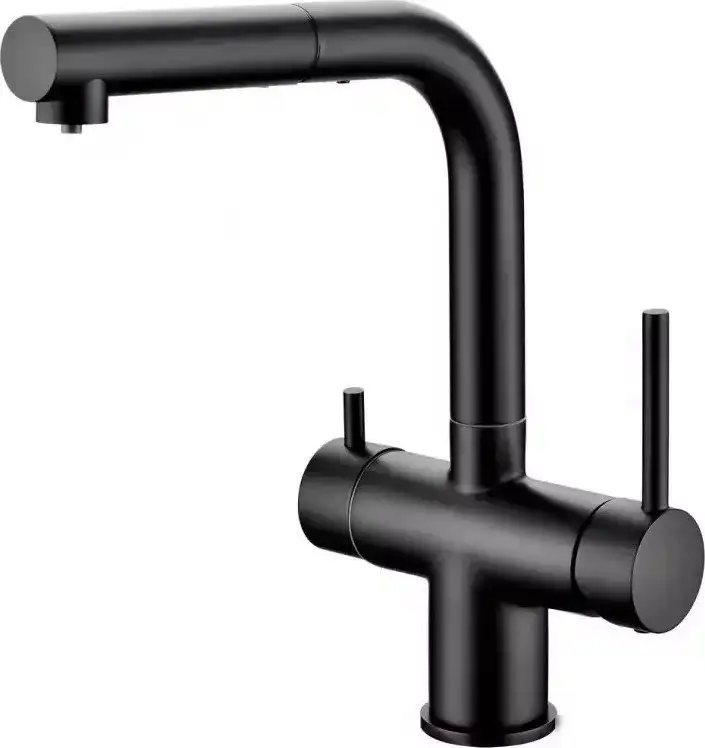 Смеситель Grocenberg GB4097 в черном матовом цвете отлично подходит для кухни и установки на раковину или столешницу. Он выполнен из прочной латуни, что обеспечивает долговечность и надежность. Смеситель оснащен встроенным краном для питьевой воды, что удобно для приготовления напитков и мытья посуды. Керамический картридж диаметром 40 мм обеспечивает плавное и точное управление температурой и потоком воды. Излив обладает поворотной функцией и выдвижным гибким шлангом, что облегчает мытье и доступ к воде. Он занимает одно монтажное отверстие, идеально подходит для современного дизайна кухни. Благодаря качественной конструкции, смеситель легко эксплуатировать длительное время. Удобство использования и стильный внешний вид делают его хорошим выбором для любой кухни.