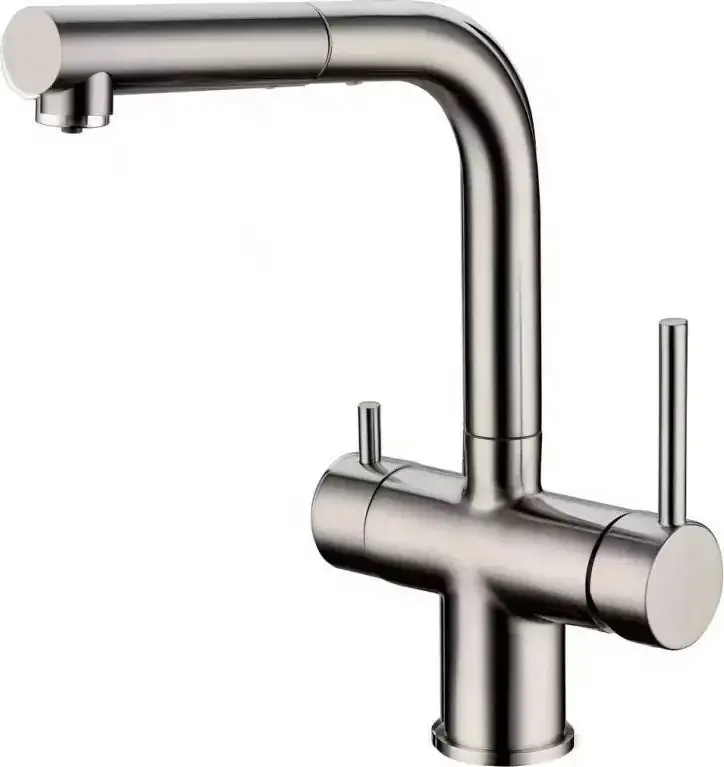 Смеситель Grocenberg GB4097 в никель цвете отлично подходит для кухни и подачи питьевой воды. Он устанавливается на раковину или столешницу, имеет одно монтажное отверстие. В конструкции применяется прочная латунь и керамический картридж диаметром 40 мм, который позволяет легко регулировать поток воды. Смеситель оснащен поворотным изливом длиной 245 мм, что повышает его удобство в использовании. Выдвижной и гибкий излив облегчает мытье посуды и очистку раковины. Благодаря встроенному крану для питьевой воды, вы сразу получаете доступ к чистой воде без дополнительных устройств. Высота излива составляет 255 мм, что удобно для работы с крупными предметами. Простая установка и надежные материалы делают этот смеситель практичным и долговечным.