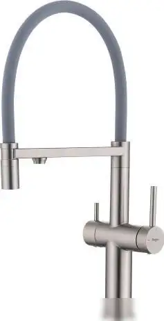 Смеситель Raglo R20.63.05 предназначен для кухни и подойдёт для установки на раковину или столешницу, имеет один монтажное отверстие. Он управляется одним рычагом, что облегчает регулировку воды. Смеситель выполнен из прочной стали и покрыт в цвете сатин, что делает его стильным и долговечным. Внутри установлен керамический картридж диаметром 35 мм, который обеспечивает плавное и точное управление. Излив поворотный и выдвижной, что позволяет удобно направлять воду. Есть функция регулировки угла подачи воды через аэратор, что делает пользование более комфортным. Встроенный кран для питьевой воды помогает безопасно получать чистую воду. В комплект входит сливной гарнитур, но донный клапан не предусмотрен. Это практичный и удобный смеситель для повседневного использования на кухне.