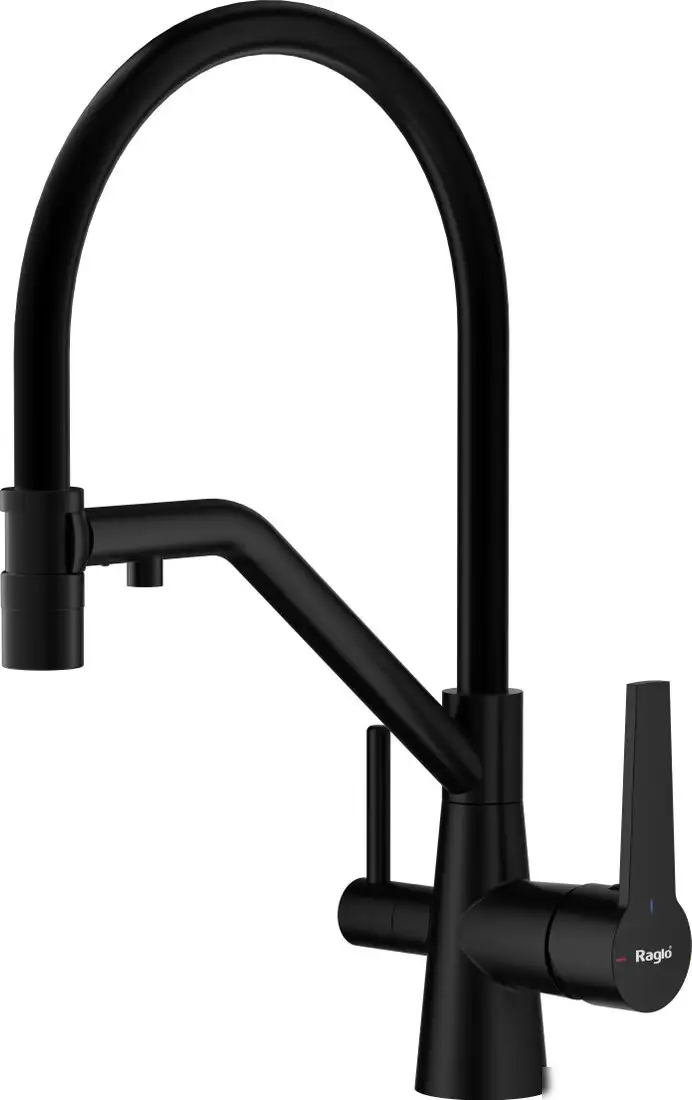 Смеситель Raglo R80.62.06 предназначен для использования на кухне и легко устанавливается на раковину или столешницу благодаря одному монтажному отверстию. Он имеет однорычажный механизм, что позволяет удобно регулировать температуру и поток воды. Изделие выполнено из прочной латуни черного цвета, что делает его стильным и долговечным. Встроенный кран для питьевой воды обеспечивает безопасность и удобство при приготовлении пищи и умывании. Поворотный излив с выдвижным гибким шлангом позволяет легко мыть посуду и протягивать воду в нужную сторону. Благодаря керамическому картриджу диаметром 35 мм вода регулируется плавно и точно.
