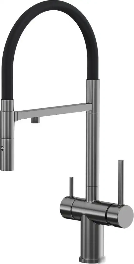 Смеситель Reflexion Lago RX9901BL предназначен для кухни и устанавливается на раковину или столешницу при помощи одного монтажного отверстия. Он оборудован однорычажным механизмом, который позволяет легко регулировать температуру и поток воды. Корпус выполнен из латунь с серым покрытием, а внутренний механизм — из керамики, что обеспечивает долговечность и плавное управление. Устройство включает встроенный кран для питьевой воды, что удобно для приготовления напитков. Поворотный и выдвижной излив позволяют легко направлять поток воды точно в раковину или по необходимости. Есть возможность регулировать длину излива (220 мм), а высота излива составляет 194 мм — это подходит для крупной посуды. Благодаря компактным габаритам (длина 220 мм, высота 503 мм) он отлично вписывается в кухонное пространство.