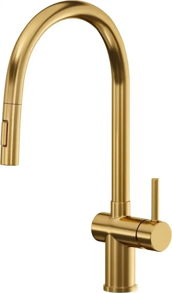 Смеситель Reflexion Lago RX9904GD создан для установки на кухню и подходит для раковины или столешницы. Он оснащён однорычажным механизмом, что облегчает управление водой и температурой. Кран выполнен из прочной нержавеющей стали в стильном золотом цвете. Встроенный керамический картридж обеспечивает долгий срок службы и плавное управление. Поворотный излив с выдвижной/гибкой насадкой позволяет легко мыть посуду и товары. Максимальный вылет излива достигает 217 мм, а высота — 422 мм, что удобно для активной работы. Высота излива составляет 202 мм, что обеспечивает комфортный доступ к раковине. Конструкция не имеет каскадного излива или ограничителей расхода воды, что позволяет регулировать поток по необходимости. Этот смеситель сочетает стильный дизайн и функциональность, делая процесс мытья более удобным.