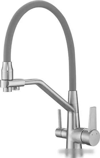 Смеситель Rose R558L предназначен для кухни и легко устанавливается на раковину или столешницу благодаря одному монтажному отверстию. Он выполнен из прочной латуни с матовым серым покрытием, которое гармонично впишется в любой интерьер. Механизм однорычажный позволяет легко регулировать температуру и поток воды одним движением. Встроенный кран для питьевой воды обеспечивает безопасное использование питьевой жидкости. Керамический картридж гарантирует долгий срок службы и плавное управление. Поворотный и выдвижной гибкий излив с аэратором позволяет удобно мыть посуду и наливать воду. Благодаря компактным размерам (длина 228 мм, высота излива 215 мм) он не занимает много места.
