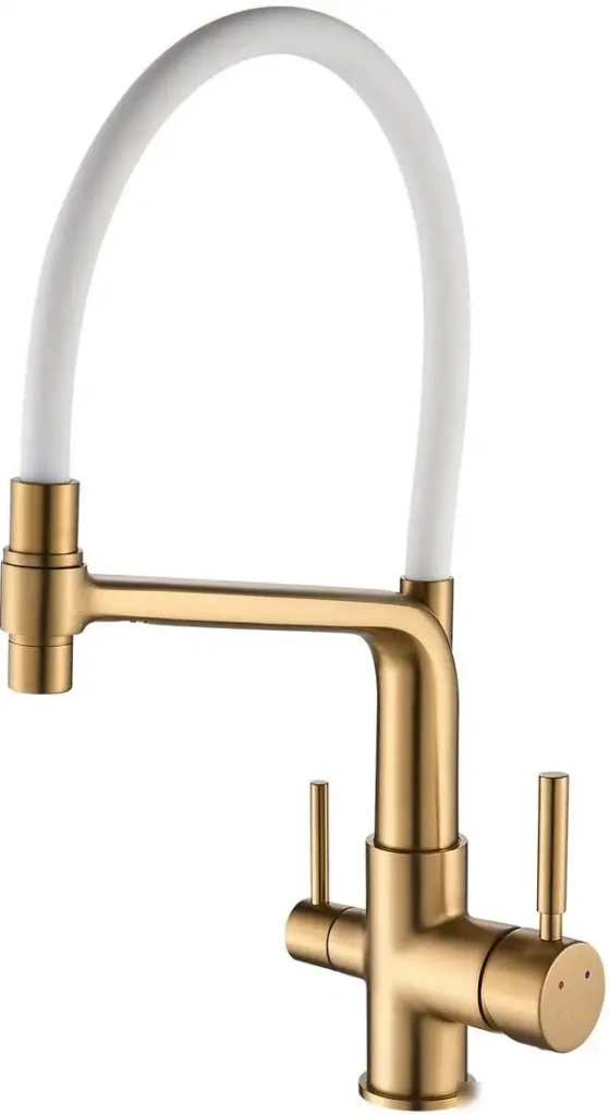 Смеситель Rose R658G предназначен для кухни и легко устанавливается на раковину или столешницу. Он выполнен из прочной латуни и доступен в белом, золотом и сатиновом цветах, что помогает подобрать дизайн под интерьер. Механизм однорычажный позволяет удобно регулировать температуру и поток воды одной рукой. Встроенный кран для питьевой воды обеспечивает вас чистой и безопасной водой. Керамический картридж гарантирует долговечность и беспрепятственное использование. Поворотный излив с выдвижным гибким шлангом делает мытьё посуды более удобным. Высота смесителя — 445 мм, а длина вылета — 228 мм, что даёт простор для мытья. Он компактно занимает пространство и легко управляется. Такой смеситель отлично дополнит любую кухню благодаря простоте использования и современному дизайну.