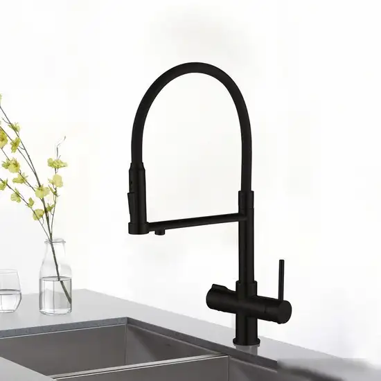 Смеситель Rose R758H предназначен для кухни и легко устанавливается на раковину или столешницу. Он выполнен из прочной латуни и имеет стильный черный цвет, который отлично впишется в современную кухню. Смеситель оснащен однорычажным механизмом, что позволяет легко регулировать температуру и поток воды одним движением. Благодаря поворотному изливу на 360°, вы сможете удобно мыть посуду и наполнять кастрюли. Выдвижной и гибкий излив с аэратором помогает направлять воду точно туда, где нужно, облегчая работу на кухне. Керамический картридж диаметром 35 мм обеспечивает долговечность и устойчивость к повреждениям. Этот смеситель сочетает в себе практичность и современный дизайн, делая работу на кухне более комфортной.