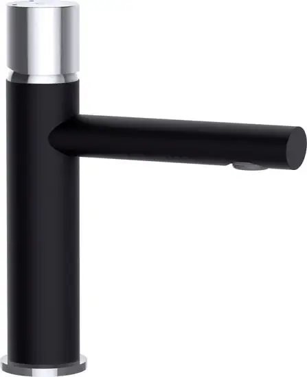 Смеситель Rubineta Etna-18 в черном цвете предназначен для установки умывальника. Он изготовлен из металла — латуни, что делает его прочным и долговечным. Смеситель имеет одноручковый механизм, которым легко регулировать воду. Высота изделия составляет 172 мм, а длина излива — 110 мм, что удобно для использования. В нем есть керамический картридж диаметром 25 мм, он обеспечивает плавное и надежное управление водой. Он не имеет ограничения расхода воды и поворотного излива.