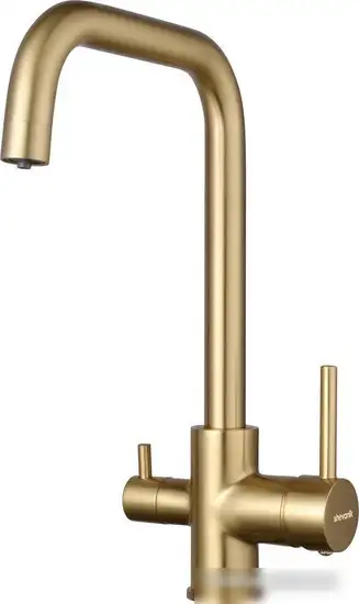 Смеситель Shevanik S228G предназначен для использования на кухне и легко устанавливается на раковину или столешницу. Этот однорычажный смеситель выполнен из металла цвета золота и имеет прочную латунную конструкцию. Он оснащён встроенным краном для питьевой воды и керамическим картриджем, что обеспечивает долгий срок службы и плавное управление потоком воды. Излив легко поворачивается, что удобно при мойке посуды и приготовлении еды. Высота изделия составляет 330 мм, а излива — 245 мм, что делает его удобным для использования.