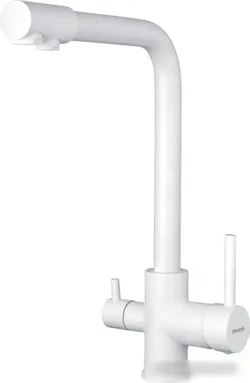 Смеситель Shevanik S328C предназначен для кухни и устанавливается на раковину или столешницу с одним монтажным отверстием. Он выполнен из прочной латуни и имеет белый цвет, что легко вписывается в любой дизайн кухни. Встроенный кран для питьевой воды обеспечивает удобство и безопасность использования. Механизм одноручного управления позволяет быстро регулировать температуру и поток воды. Керамический картридж гарантирует долговечность и устойчивость к износу. Излив повернутый, его высота 295 мм, а общая высота – 330 мм, что удобно для мойки посуды и продуктов. Такой смеситель — практичное решение для любой кухни.