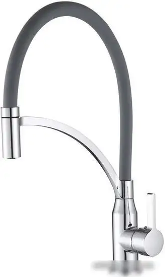 Смеситель Shevanik S643-9 предназначен для использования на кухне. Он подходит для монтажа на раковину или столешницу с одним отверстием. Этот смеситель выполнен из прочной латуни и окрашен в серый цвет, что хорошо сочетается с разной кухонной техникой. Механизм управляется одним рычагом, что делает использование удобным и простым. В смесителе установлен керамический картридж диаметром 35 мм, он обеспечивает долгое и надежное функционирование. Поворотный излив позволяет легко регулировать поток воды, а выдвижной или гибкий излив с аэратором удобно для мытья посуды и фруктов. Такой смеситель прост в установке и использовании, отлично вписывается в современную кухню.