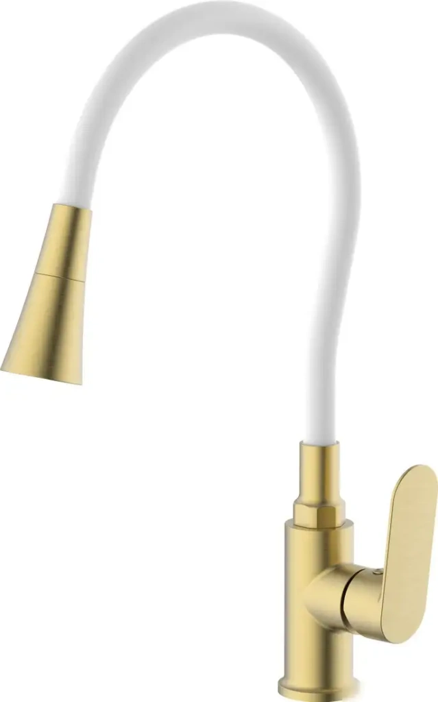 Смеситель Splenka S41.43.03 предназначен для кухни и устанавливается на раковину или столешницу. Он оснащён однорычажным механизмом, который облегчает управление температурой и напором воды. Смеситель выполнен из латуни и представлен в белом и золотом цветах. Встроенный керамический картридж диаметром 35 мм обеспечивает долговечность и плавное управление. Поворотный и выдвижной излив позволяют удобно набирать воду и мыть посуду. Высота изделия – 356 мм, длина излива – 200 мм, а высота излива – 146 мм. Благодаря выдвижному изливу вы сможете легко дотянуться до любой части раковины. Смеситель не имеет каскадного излива, возвратной пружины и ограничителя расхода воды, что делает его простым в использовании.