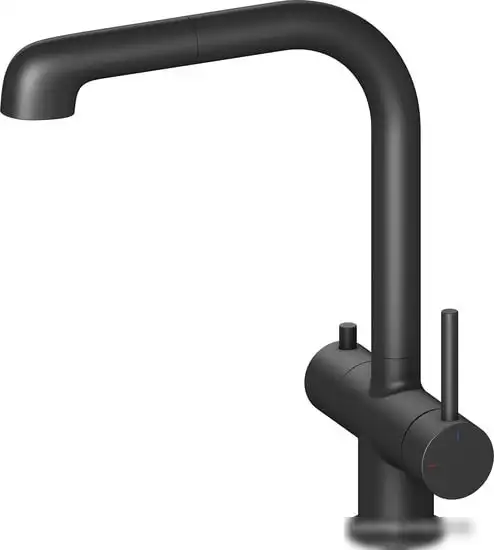 Смеситель Timo Saona 2346/03FL черного цвета идеально подходит для установки на кухонную раковину или столешницу. Он выполнен из прочной латуни и имеет современный дизайн, подходящий к каменной мойке. В изделии установлен керамический картридж диаметром 35 мм, что обеспечивает плавное регулирование температуры и потока воды. Излив поворачивается на 360°, благодаря чему удобно мыть посуду и продукты. Также есть выдвижной гибкий излив с аэратором, который помогает экономить воду и делает процесс мытья более комфортным. Благодаря встроенному крану для питьевой воды, у вас всегда под рукой чистая питьевая вода. Смеситель отличается внушительными размерами, его длина излива составляет 235 мм, а высота — 286 мм.