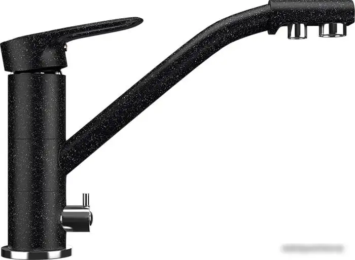Смеситель Ulgran U-010 308 в черном цвете идеально подойдет для кухни. Он предназначен для установки на раковину или столешницу с одним монтажным отверстием. Благодаря однорычажной конструкции вы легко управляете температурой и напором воды. Встроенный кран для питьевой воды обеспечивает здоровье и безопасность. Керамический картридж диаметром 40 мм делает работу плавной и долговечной. Поворотный излив длиной 240 мм позволяет удобно мыть посуду и продукты. Латунный корпус гарантирует прочность и надежность. Этот смеситель прост в использовании и обслуживании. Он отлично впишется в современный интерьер кухни.