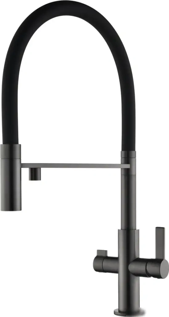 Смеситель Aquasanita Soifos 7763-T в цвете графит отлично подойдет для кухни. Он устанавливается на раковину или столешницу с одним монтажным отверстием и управляется одним рычагом. Смеситель оснащен керамическим картриджем, который обеспечивает долговечность и легкое управление. Поворотный и выдвижной излив позволяют удобно регулировать поток воды и напор. Встроенный кран для питьевой воды дает возможность быстро получать чистую воду. Конструкция выполнена из латуні, что обеспечивает надежность и стойкость к износу. Высота смесителя — 417 мм, длина излива — 220 мм, а высота излива — 172 мм. Такой дизайн и функциональность делают работу на кухне проще и комфортнее.