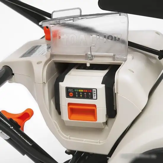 ручной, аккумуляторный двигатель, захват 46x27 см, выброс на 10 м